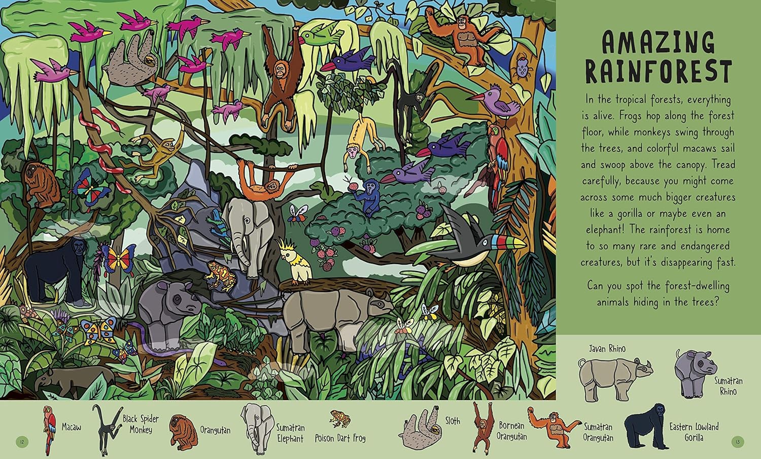 Travel around the world searching for rare and endangered animals. The Busy Book of Search and Find: Amazing Animals is a fun spin on a traditional search and find activity book that also offers a strong message about the importance of protecting the many exotic and endangered creatures that inhabit our planet. Find the amazing animals throughout 11 different ecosystems! Sturdy hardcover size 10″ x 12″Great gift book to give to a child, hours of fun Solutions are included in the back of the book Vibrant and colorful illustrations with details packed in every scene!