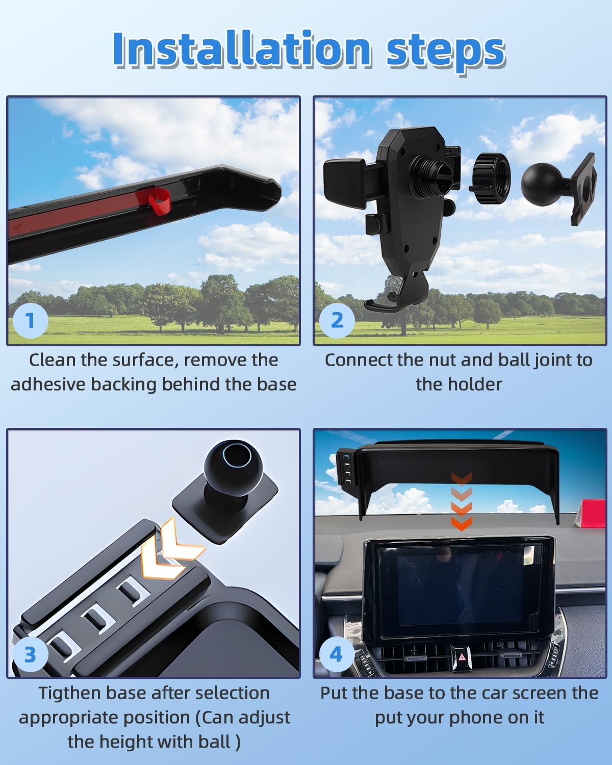 PREMIUM MATERIAL&EASY TO INSTALLATION -Toyota Corolla Car phone mount is made of high-grade ABS material, which not only improves the quality, but also Phone Mount No drilling or any tools required. Simply attach the Car Phone Holder to the touchscreen /Air vent, then install the Cell phone holder to the base to complete the installation.With this cell phone car mount, you can easily use navigation and other functions