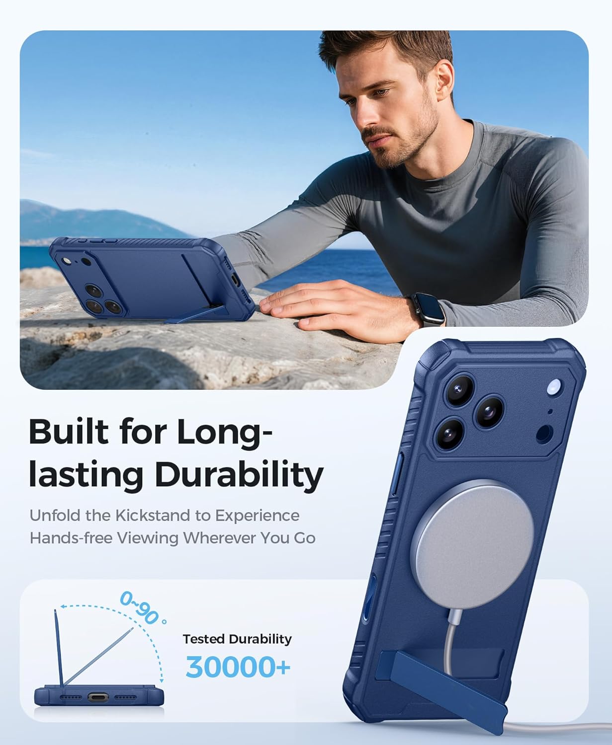 【Adjustable Metal Stand】The metal kickstand design of the iPhone Pro Max case cleverly folds and tucks away on the back of the device, adding no extra bulk and remaining completely hidden when folded. The stand’s presence is virtually imperceptible. When extended, it offers free angle adjustment from 0 to 90 degrees, providing stable and flexible support whether you’re reading, binge-watching shows, or chatting face-to-face with friends. It helps you achieve a more comfortable viewing angle, preventing neck and back strain, and delivers a more convenient lifestyle experience. This stand case has undergone over 30,000 open-close tests to ensure lasting reliability for daily use
