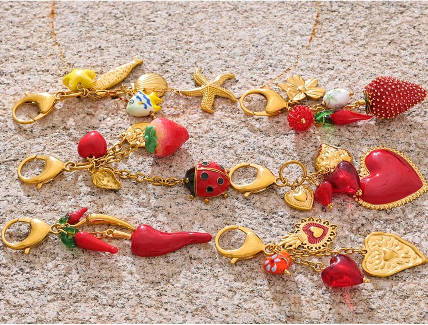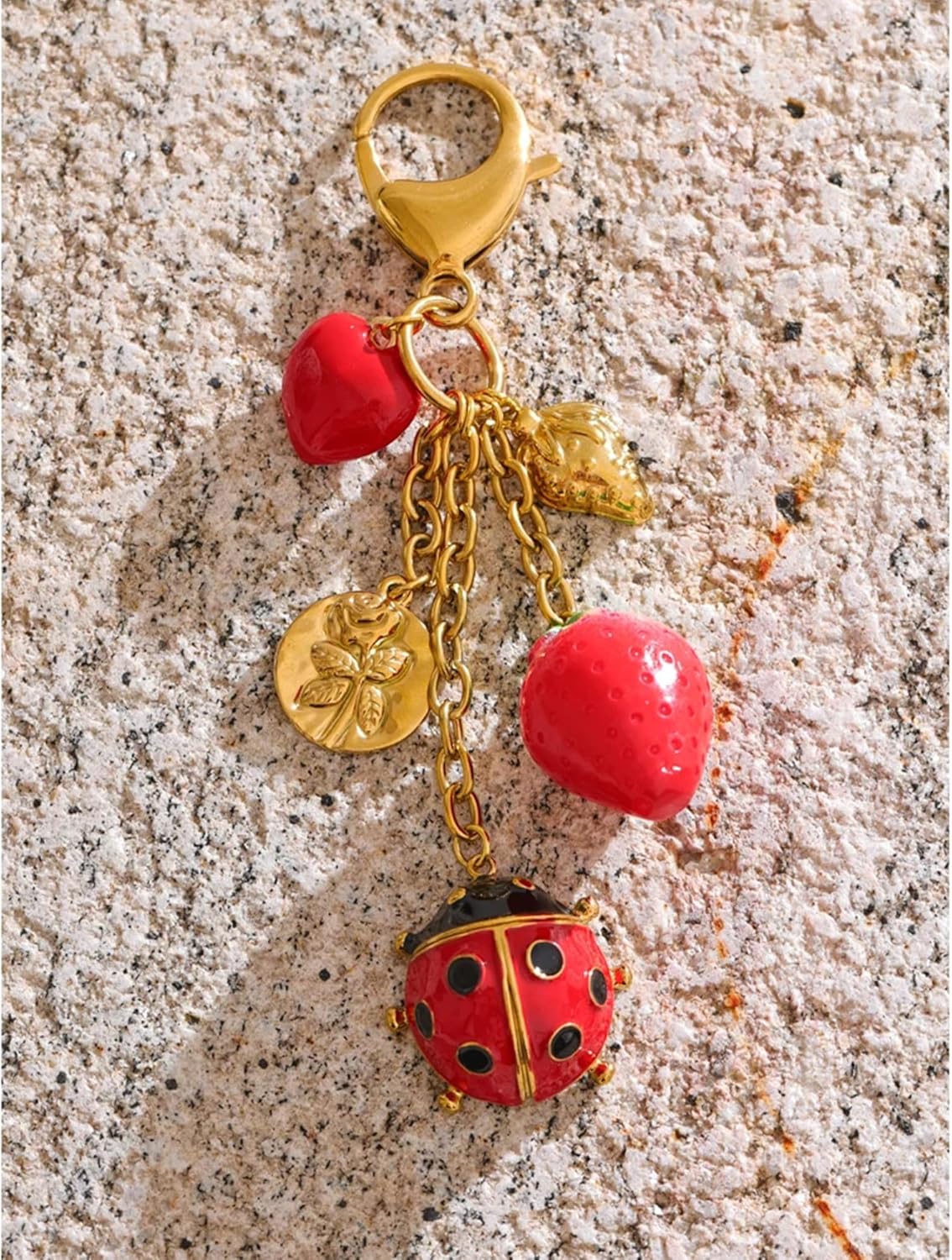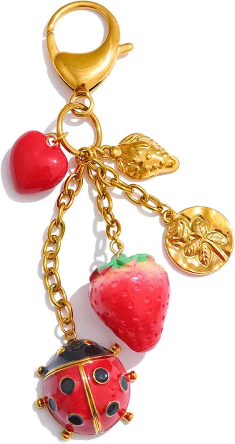 Elevate your everyday style with the Mchic Cute Keychain, designed especially for women who love adding a playful yet elegant touch to their handbags and purses. This charming gold keychain features a delightful mix of trendy charms including strawberries, flowers, hearts, starfish, and ladybugs — each carefully crafted with resin, ceramic, and gold-tone alloy to ensure durability and a luxurious look.