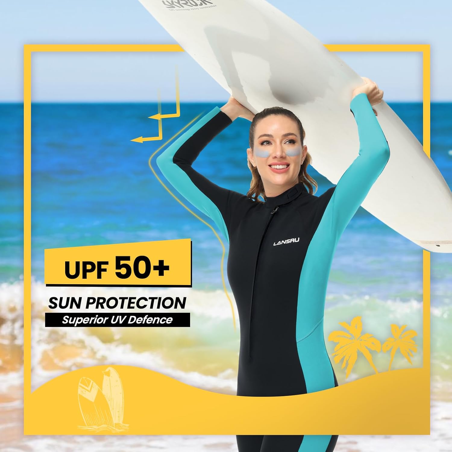 Safety & Sun Protection: The long-sleeved full swimsuit has comprehensive protection for your water activities. It protects skin stings from sea lice, jellyfish, and other marine organisms and cuts caused by reefs. THICKENED KNEE PADS can keep your knee safe from injury, permitting your water activities like surfing, paddleboarding, and kayaking. Full wetsuits double as rash guards reduce skin exposure and contain UV protection, providing UPF 50+ sun protection for your entire body.